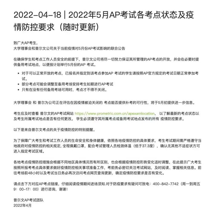 沪上学校相关学校接到通知,因为防疫要求,于5月2日开始的AP考试考场取消执行,大学理事会和普尔文正在积极评估是否会提供补考机会和研究退费事宜,并在5月初公布相关信息,请广大考生耐心等待。