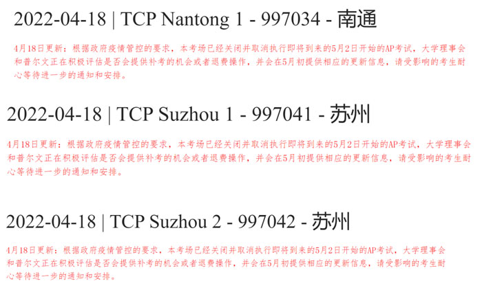 江苏3个考场:苏州2个、南通1个,已经确认关闭。
