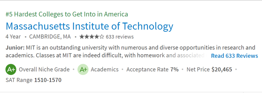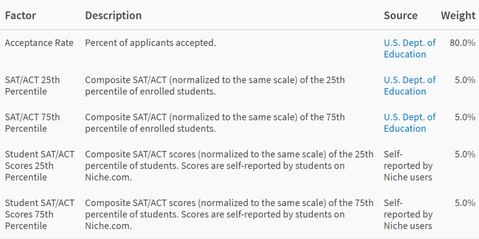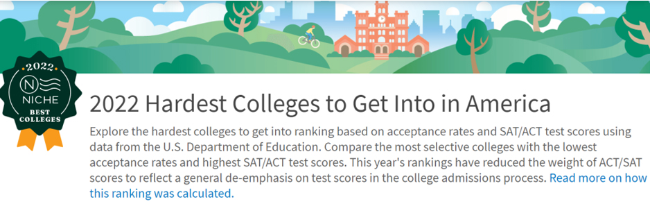 Niche排名主要基于美国各大高校公布的最新录取率、SAT/ACT考试成绩,以及美国教育部的数据统计而成。