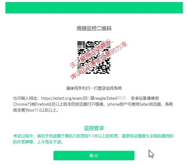 5)云监考(鹰眼)监控开启且按照要求摆放后,在考试主设备的界面上点击“确 定”按钮;