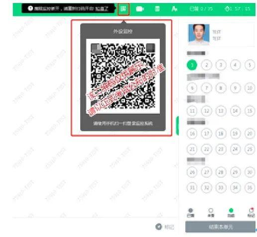6)考中若出现网络故障,修复网络后,在考试主设备答题界面点击下图中标示 的图标重新打开鹰眼监控二维码,使用智能手机或重新扫描并登陆云监考(鹰眼) 监控(如下图所示)