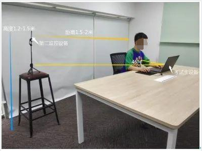 第二视角云监考(鹰眼)监控设备摄像头建议架设在考试设备的侧后方、距离1.5 米-2 米处、摄像头高度 1.2-1.5 米,与考试位置成 45 度角(如下图所示)。