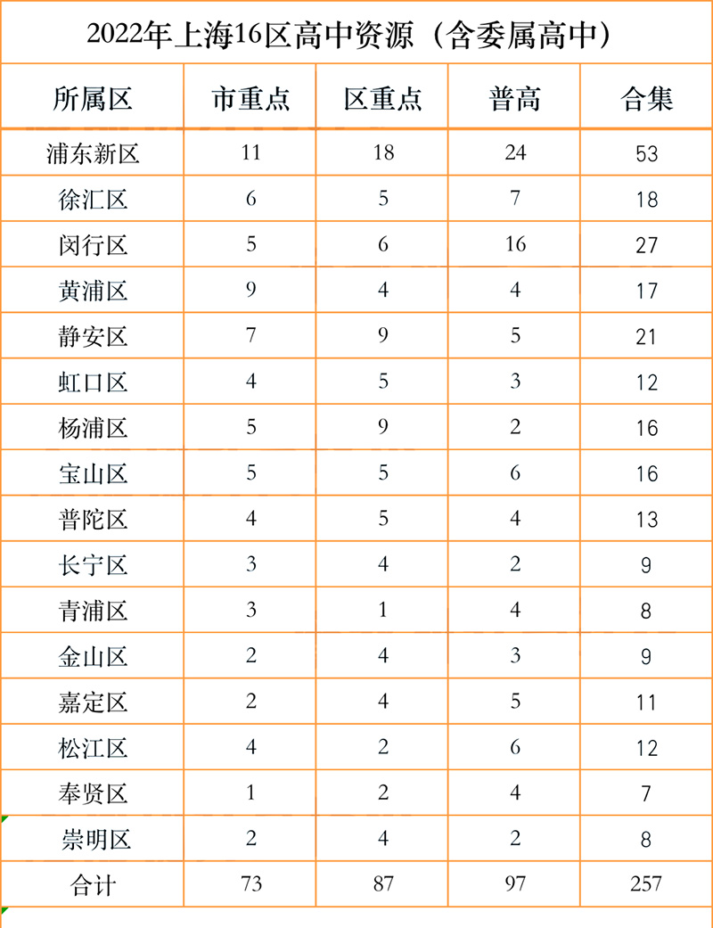 2022年上海招生市重点73所、区重点87所、普高97所。