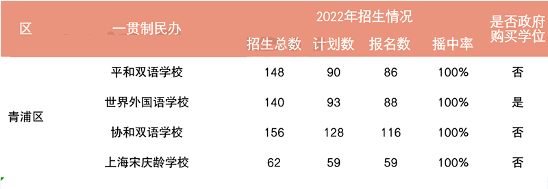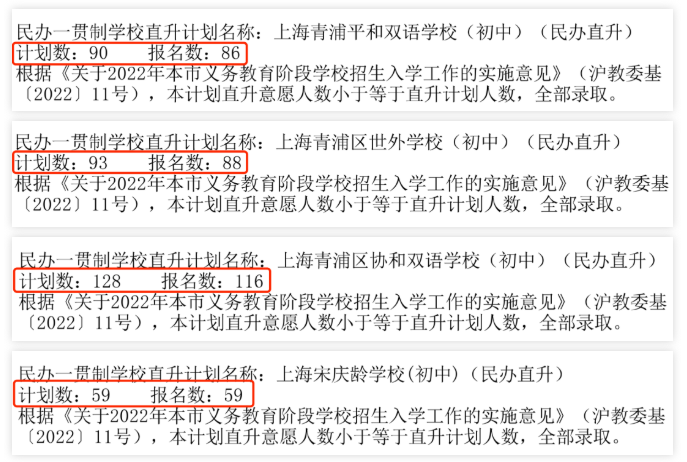 青浦区共四所民办一贯制学校,其中世外是政府购买学位,这四所学校的报名数<计划数,全部录取。