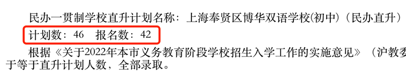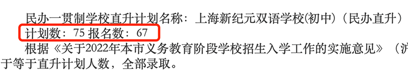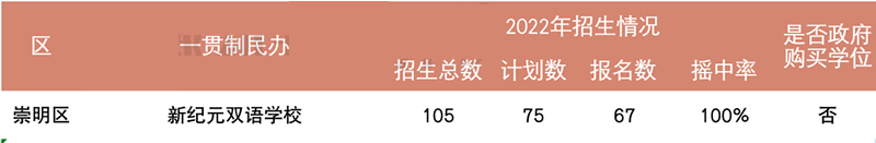 崇明区仅新纪元双语一所一贯制,今年报名数<计划数,全部录取。