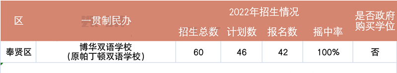 奉贤区仅一所民办一贯制,上海奉贤区博华双语学校(原帕丁顿双语),今年报名数<计划数,全部录取。