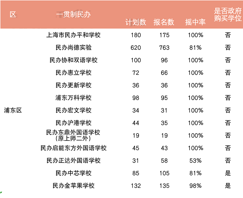 浦东区四所学校需要摇号录取,尚德实验、正达外国语、民办中芯、民办金苹果,其他学校直接录取。