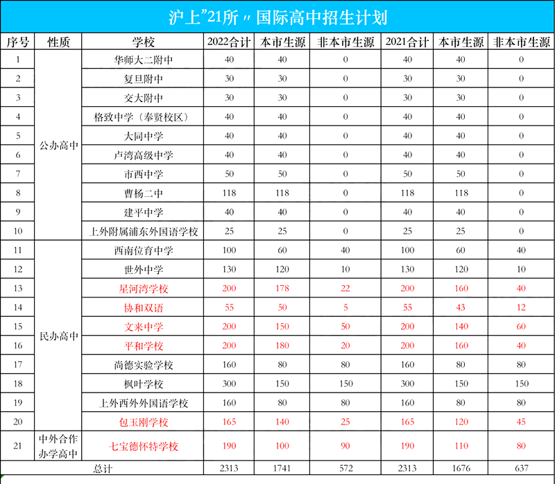今年21所国际高中总招生计划人数不变,依旧是2313人,但是本市生源比重增加65人,非本市生源减少。