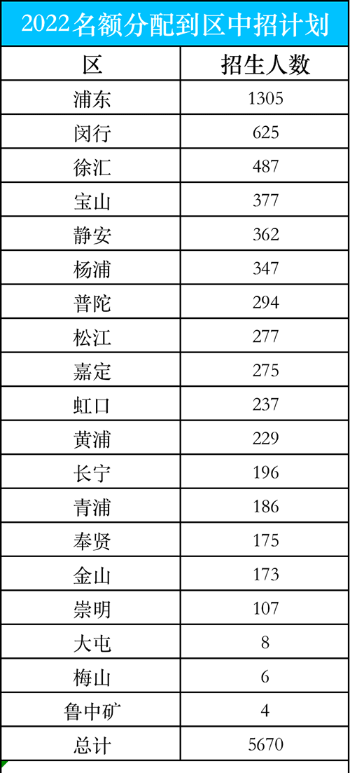 招生数量TOP5的有:浦东新区1305个、闵行区625个、徐汇区487个、宝山区377个、静安区362个,区考生人数越多,名额分配到区就越多。