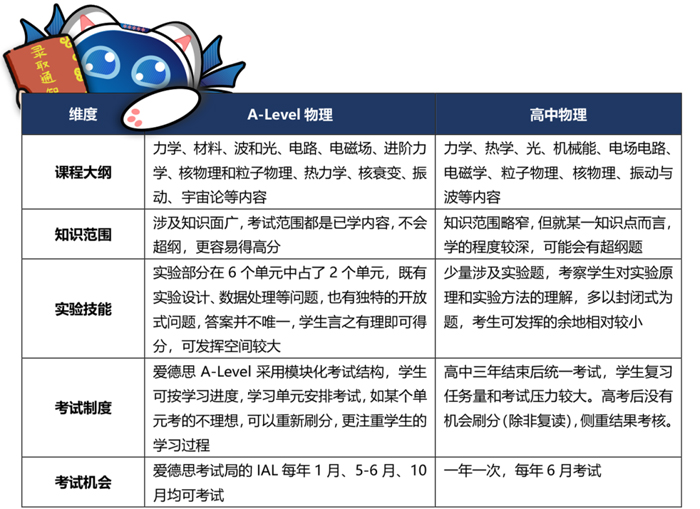 从单个科目来看,比如国内高中物理和A-Level物理科目,两者在课程大纲、知识范围、实验技能和考试机会等维度各有不同: