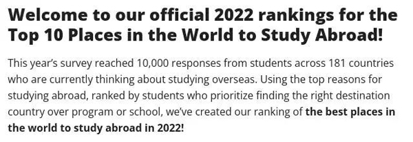 由于这份排名的依据是学生们在选择目标留学国家时最看中的因素,因此它并不像QS排名更专注学术,而是侧重于学生留学的体验感。