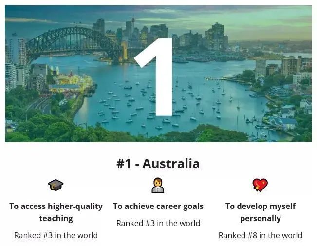 澳大利亚在“获得高质量教育”排第三,“获得职业目标”排第三,“个人发展”排第八。2022年QS世界大学排名中,前50名的大学,澳洲占五席。