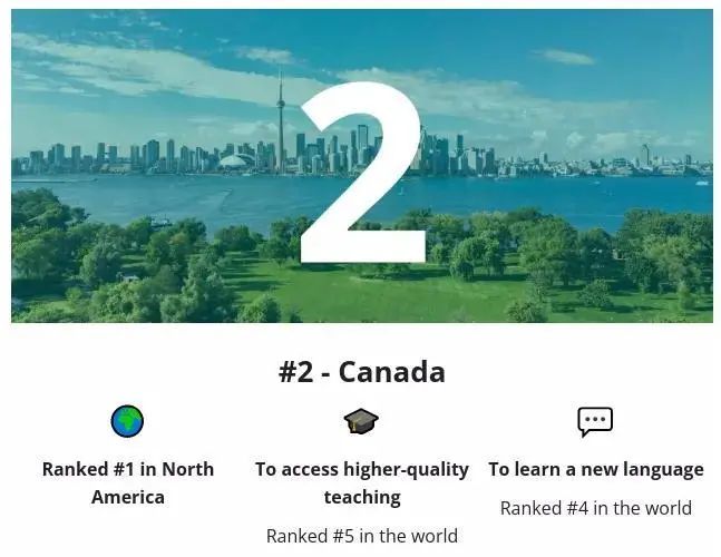 加拿大在“获得高质量教育”排第五,“学习一门新语言”排第四。