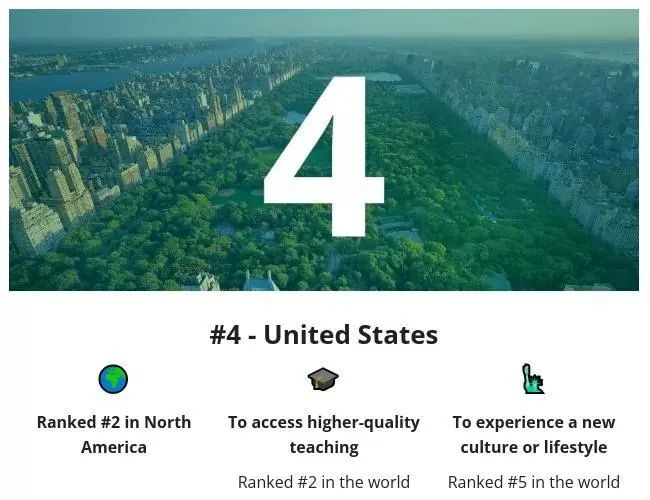 美国在“获得高质量教育”排第二,“体验新的文化和生活方式”排第五。