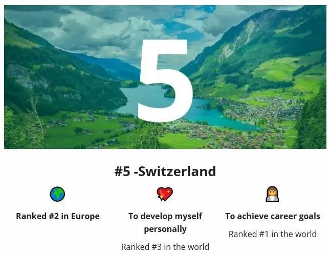 瑞士在“个人发展”排第三,“获得职业目标”排第一。