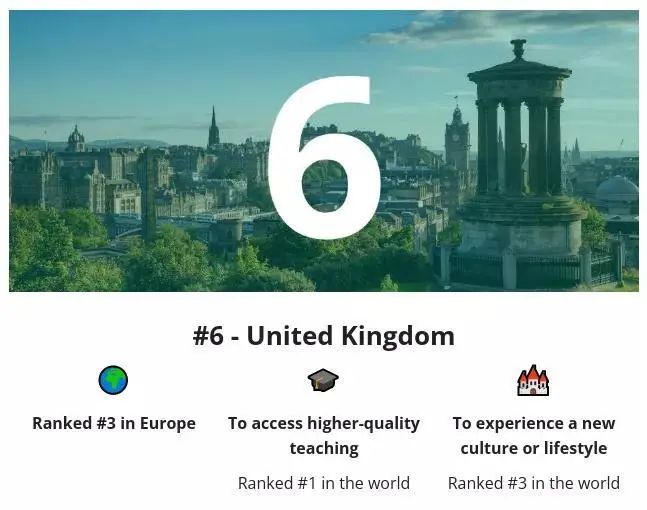 英国在“获得高质量教育”排第一,“体验新的文化和生活方式”排第三。