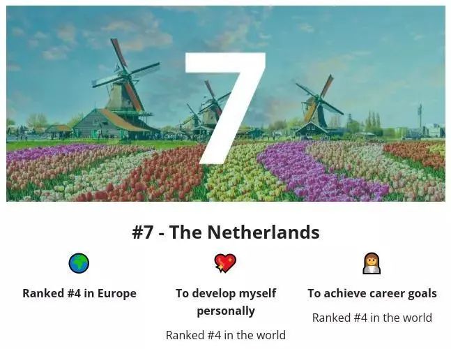 荷兰在“个人发展”排第四,“获得职业目标”排第四。