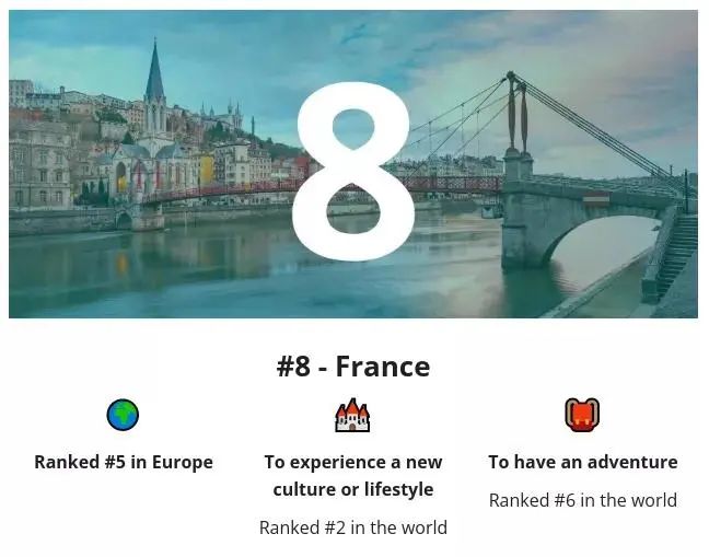 法国在“体验新的文化和生活方式”排第二,“获得一次冒险经历”排第六。