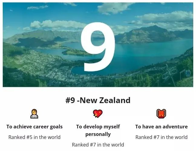 新西兰在“获得职业目标”排第五,“个人发展”排第七,“获得一次冒险经历”排第七。