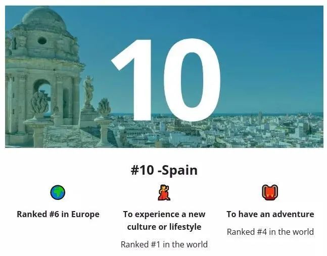 西班牙在“体验新的文化和生活方式”排第一,“获得一次冒险经历”排第四。