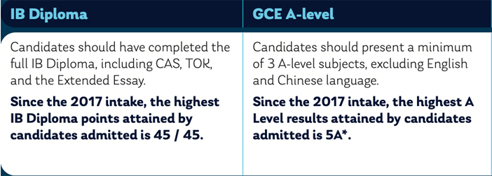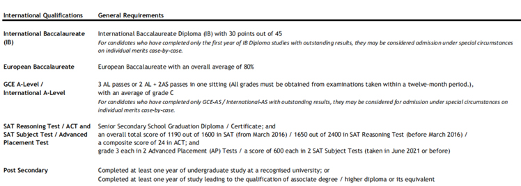 IB总分在30分及以上(45分满),或A-Level需要3门AL或2门AL+2门AS通过成绩(一年内),至少为C,2门AP3分以上加上SAT,雅思要求总分为6.0,附加面试。