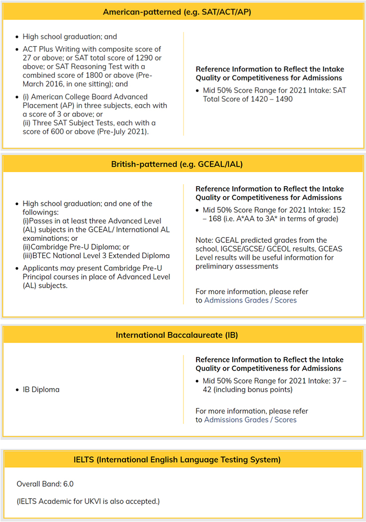 通过官方发布的2021年录取数据来看,IB学生总分在30-36之间(45分满),或A-Level需要3门AL成绩,分数换算为112-144之间,雅思要求总分为6.0。
