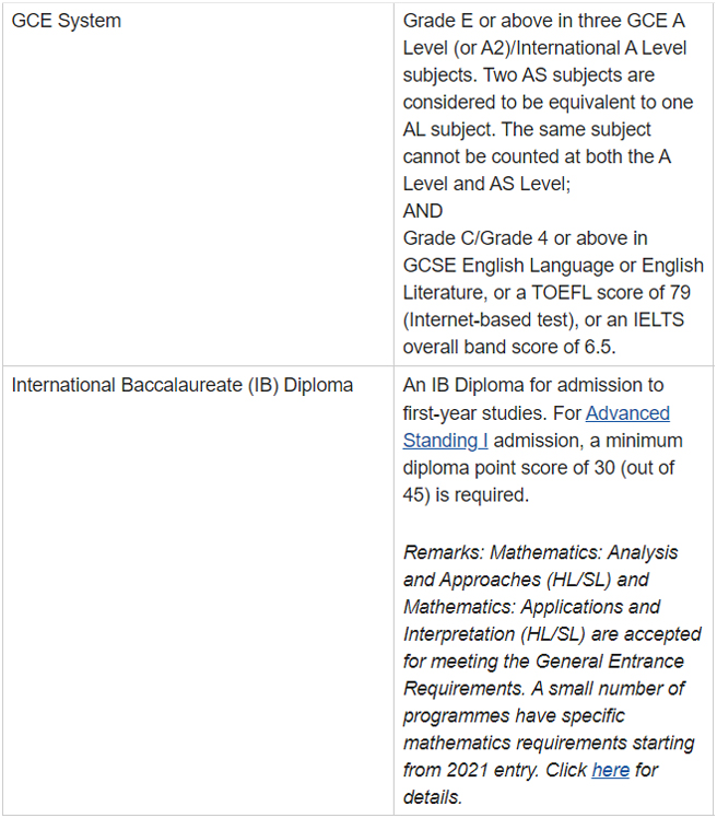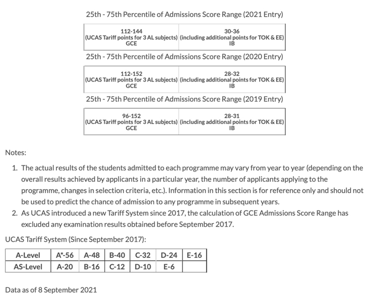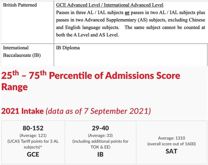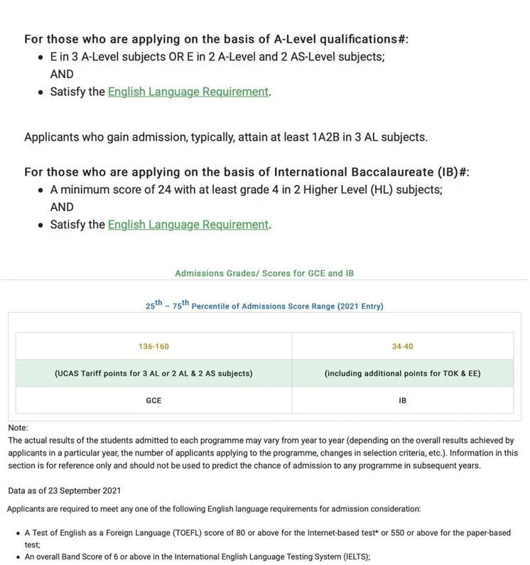 通过官方发布的2021年录取数据来看,IB学生总分在34-40之间(45分满),或A-Level需要3门AL或2门AL+2门AS成绩,分数换算为136-160之间,雅思要求总分为6.0。
