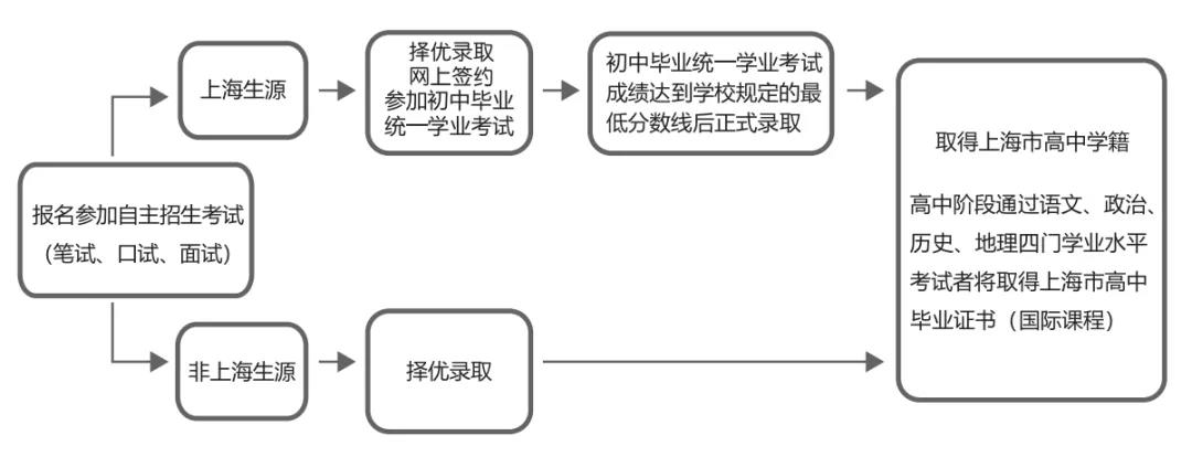 上海生源通过我校自主招生考试后会作预录取,国际课程班属于提前批次录取,中考前需与我校进行上海市教育考试院网上签约,志愿表填写与否不影响我校录取,但如果已选“自荐推优”通道,便无法被我校录取。