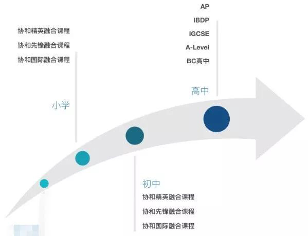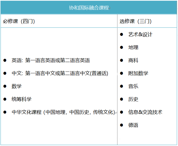 小学至初中8年级实施以国际通行课程为导向,加以中国教育内容实践特色的融合课程。