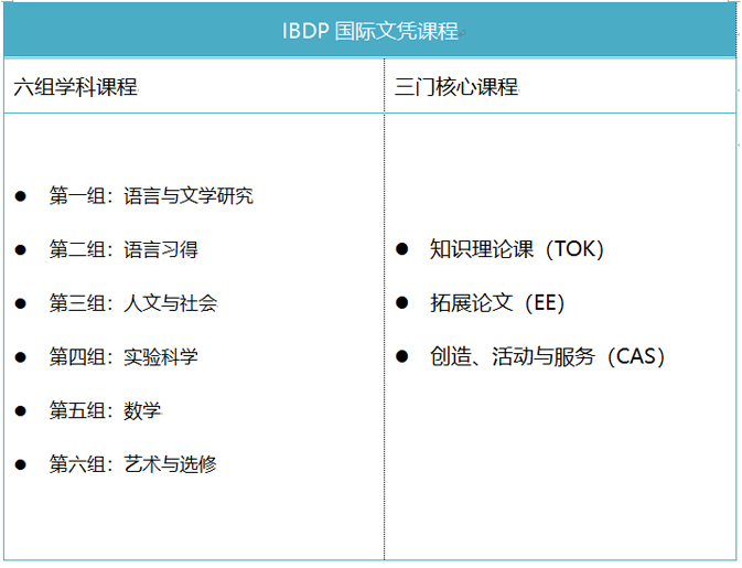 IBDP国际文凭课程:参照国际标准,六大学科课程+三门核心课程。学生需从DP六大学科主题中选择6门学科, 要求三门高水平, 三门标准水平。