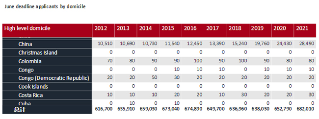 通过以上数据可以看出2021年英国本科生入学申请总数超过68万,较2020年(65万)上涨4.5%,其中中国大陆学生达到28,490人,相较2020年(24,430人)增长了16.6%,创历史新高。从中能够看出,即使2021年在疫情影响的背景下,申请英国留学的人数也还是处于增长状态。