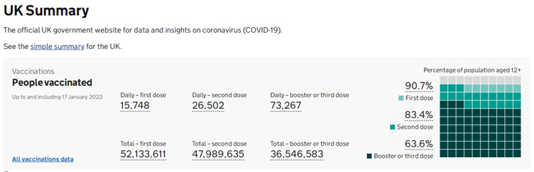 截至1月17日,英国有52,133,611人(占12岁以上人口90.7%)注射了一针新冠疫苗;47,989,635人(占12岁以上人口83.4%)注射了两针新冠疫苗;36,546,583人注射了三针新冠疫苗(占12岁以上人口63.6%)。