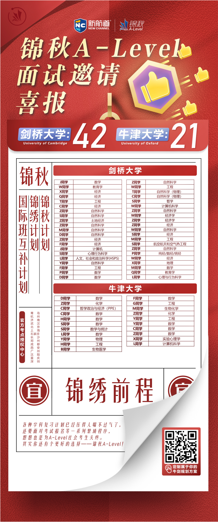 2022年申请季中,新航道锦秋A-Level共收到42封剑桥大学面试邀请,21封牛津大学面试邀请,共计63封,涉及21个专业方向。