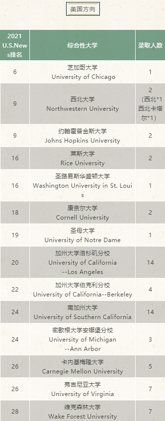 截至4月15日,99.5%的美本方向毕业生收获了U.S.News美国综合性大学前60的录取通知书。在主申英美方向,约75%的同学收到了U.S.News美国综合性大学前30、美国文理学院前30或英国G5大学的录取通知书。其中包括:芝加哥大学、康奈尔大学、西北大学、约翰霍普金斯大学、莱斯大学、加州大学洛杉矶分校、加州大学伯克利分校、剑桥大学、牛津大学、帝国理工学院、斯沃斯莫尔学院、明德学院、香港大学、东京大学等全球顶尖名校(以上录取学校均来自不同学生)。