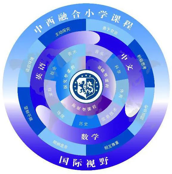 学校在上海二期课改的框架引领下,进行融合中外教育优秀元素的实践探索,我们将分科课程和综合主题探究课程的优势相结合,并制定了《中西融合的校本课程方案》,为孩子们的全面发展提供沃土。为了满足来自不同背景学生的需求,学校精心设计了中西融合的三大类型课程体系。