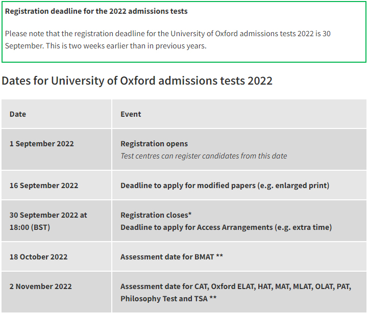 牛津各项入学考试(BMAT除外),考试时间都定于11月2日,与往年差别不大。但是报名截止时间跟剑桥一样都提前了2周。