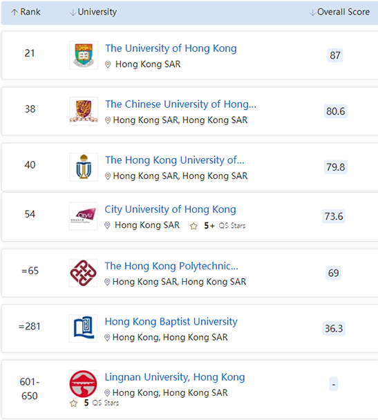 除了香港教育大学因院校性质不参与综排,其余7所大学均上榜QS 2023年世界大学排名,其中5所挤进世界前100,港大、港中文、港科大三所挤进世界前50。