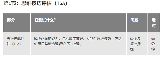 TSA考试分为两部分,第一部分是选择题考思维技巧评估,分为25道Problem Solving题目和25道Critical Thinking题目;第二部分是写作。