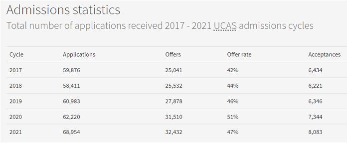 从这份数据,我们可以看出,在2017-2021这五年中,申请人数逐年递增。从17年的不到6万人,再到21年的接近7万人,看来疫情也不能扑灭留学生们求学的热情。发放的offer数量和offer率总趋势也是在逐年递增(除了2020年的小波动),因此,想申请爱大的同学们应该充满信心。