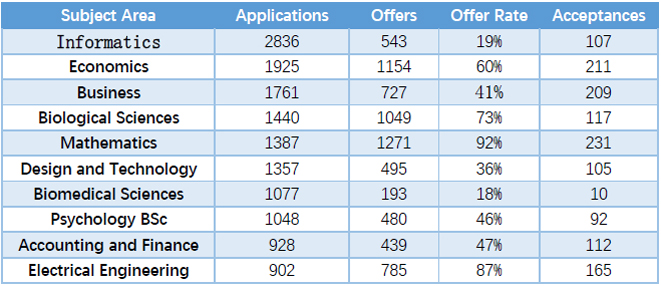 Economics经济专业和Business商科专业的申请人数分获二、三名,offer率分别是60%和41%,虽然不及第五的数学专业offer率高,但是对于留学生们来说已经相当不错了。