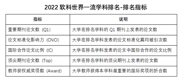“软科世界一流学科排名”使用一系列国际可比的客观学术指标对全球大学在相关学科的表现进行测量,排名指标包括学科国际权威奖项、学科顶尖成果、高水平科研产出、科研质量、国际合作等。
