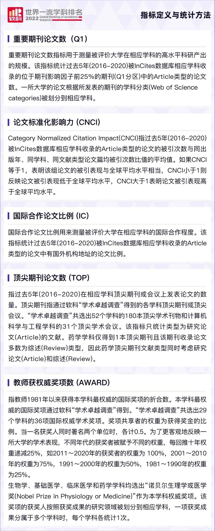 根据各个学科特性的不同,衡量学科的指标权重也有所侧重,使得整个排名更加符合行业内学者、学生或其他从业者的参考需求和权威。