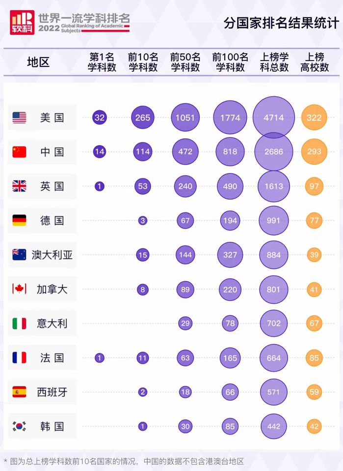中国内地共14个冠军学科,比去年增加2个。今年共有293所高校上榜,上榜总次数2686次,仅次于美国,位列全球第二。