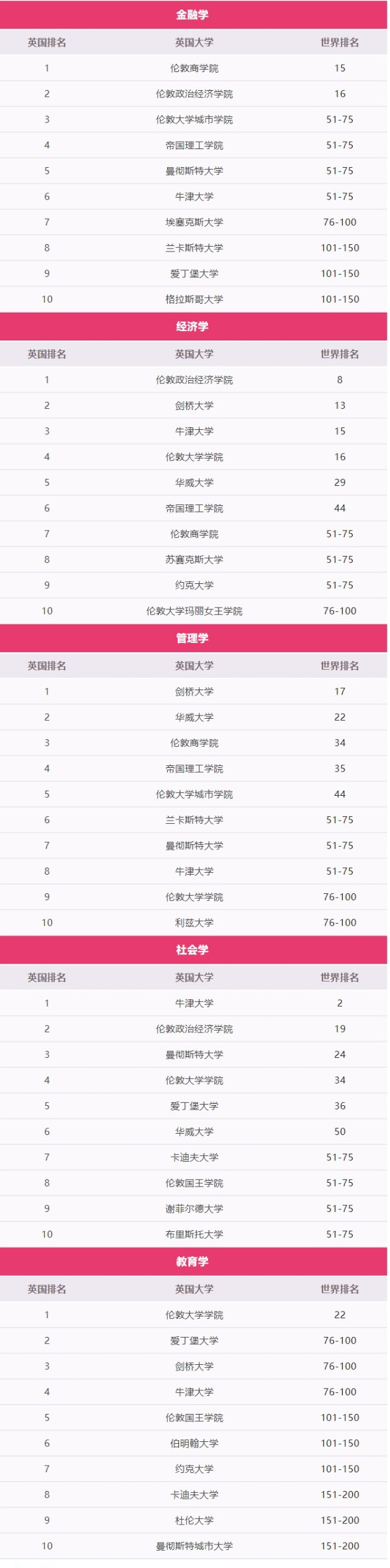 经济学——LSE(8),剑桥(13),牛津(15),UCL(16),华威(29),帝国理工学院(44)