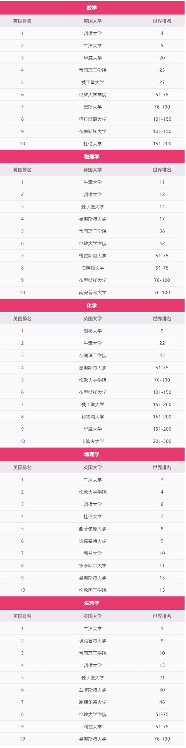 数学——剑桥(4),牛津(5),华威(20),帝国理工学院(23),爱丁堡(27)