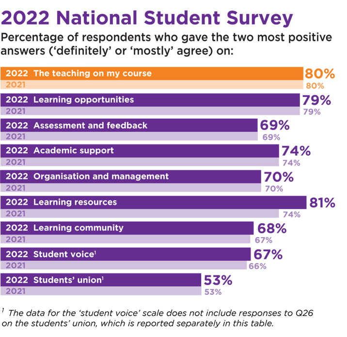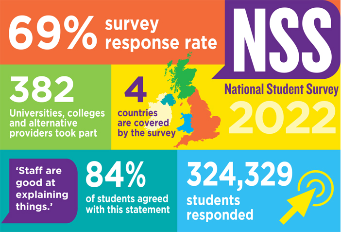NSS主要衡量的是最后一年本科生的学生满意度。如果学生的调查参与度低于50%,且每门课程的参与调查学生数少于10人,大学就不会出现在NSS结果中。
