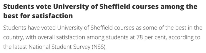 学生对谢菲尔德大学的综合满意度为78%,比大学平均满意度高出2%。