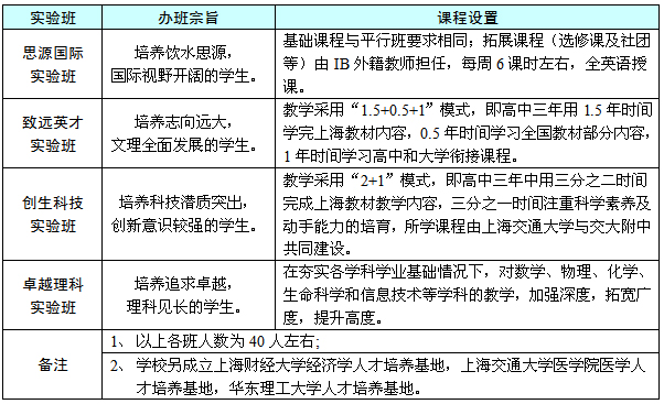 创生科技实验班:即科技班。可直推交大(年级前80名)高考新政后,不再有此直接优势。但预计会以其他形式产生优惠。学校和交大的联合培养,两年学习上海的高中教材,一年学习交大自主研发的教材。