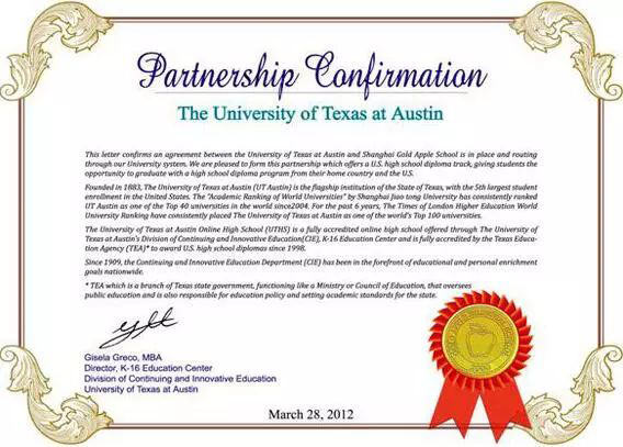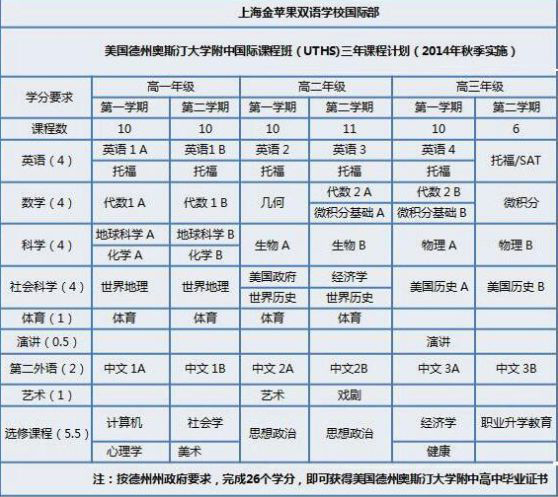美国德克萨斯大学奥斯汀分校附属高中(UTHS )授权上海金苹果双语学校开设美国国际高中课程。按照合同要求,学生需要完成5.5分UTHS必修课程,其他学分课程在金苹果学校完成,学期结束时进行学分转移,经UTHS确认后予以认可,共计完成26个学分,并通过代数Ⅰ、代数Ⅱ、化学、美国历史4门德州州政府考试(State of Texas Assessment of Academic Readiness, 以下简称STAAR)即可获得由德州教育协会认证的美国德克萨斯大学奥斯汀分校附属高中(UTHS)毕业证书。