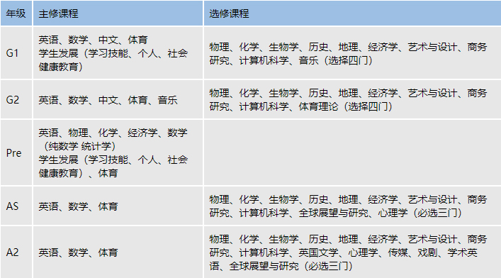 A Level 及 IGCSE各年级课程设置如下:
